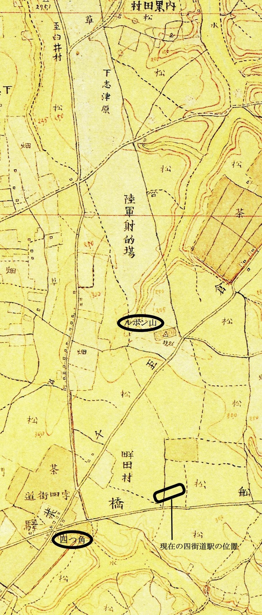 上の地図は明治15年4月に陸軍参謀本部陸地測量部が作製したフランス式彩色地図「千葉県下総国印旛郡山梨村和良比村」の一部ですが、これに加筆して、後に四街道の名称発祥地である四つ角とルボン山および現在の四街道駅の位置を示したものです。