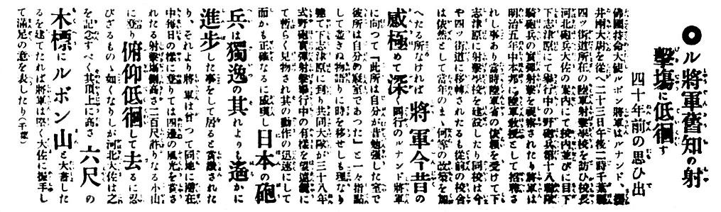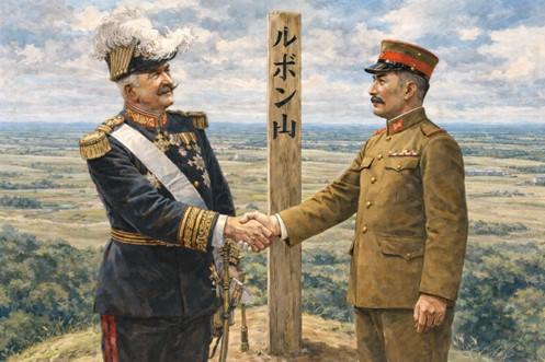 明治天皇の大喪式典にフランス大統領代表者として出席したルボンは、懐かしき四街道の地を踏み、彼自身が築いた「小山」の頂上で若き日の思い出に浸っていました。すると、側にいた陸軍野戦砲兵射撃学校校長の河北大佐が、「ルボン山」と記された大きな木標を建てました。これを見たルボン将軍は感動して、河北大佐と固い握手を交わしました。これが「ルボン山」命名の瞬間です。
