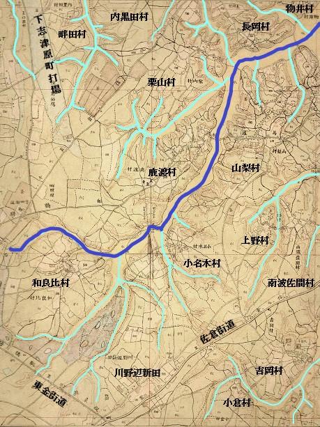 濃い青線が用水堰普請地域、但し、物井村以北の亀崎村・羽鳥村の水域は含んでいない。 (明治15年4月陸軍参謀本部陸地測量部作成フランス式彩色地図「山梨村・和良比村」に加筆)